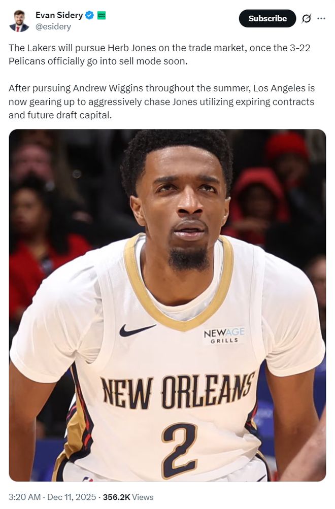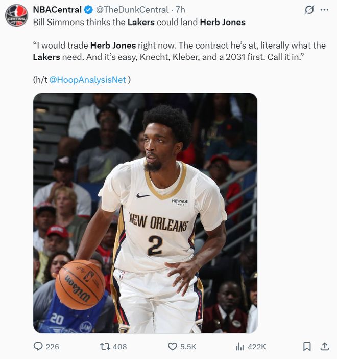NBA记者埃文-斯迪瑞这样写道:一旦战绩3胜22负的鹈鹕队进入兜售模式,湖人队会在交易市场上猛烈追求赫伯特-琼斯。湖人整个休赛期都在关注安德鲁-威金斯,但如今他们已经将矛头转向了赫伯特-琼斯。
